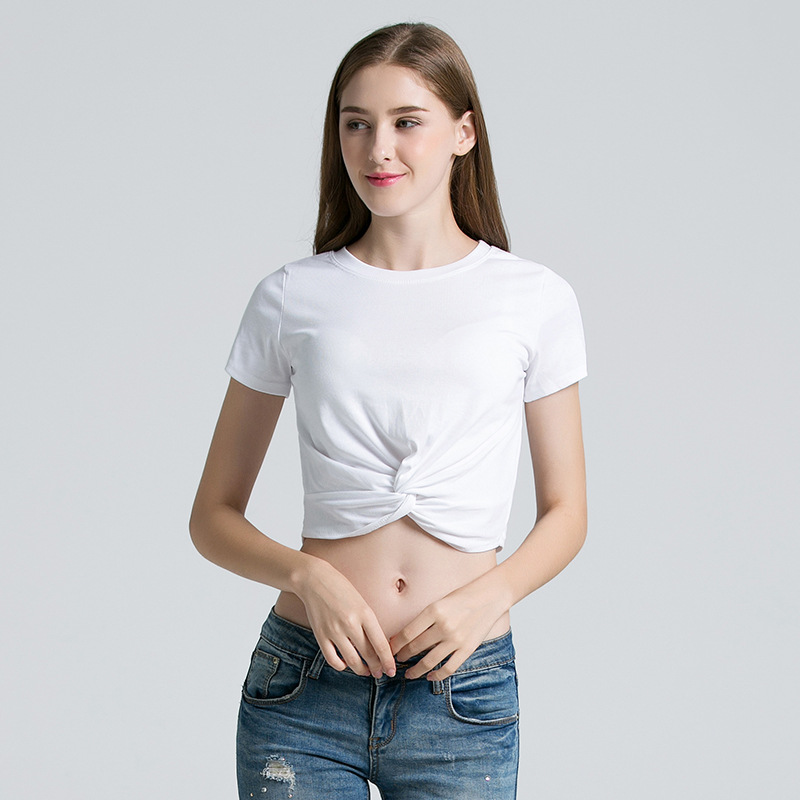 Hot Sale Womens Casual Melange Cotton Tops O Neck Short Sleeves T shirt with Front Knot
